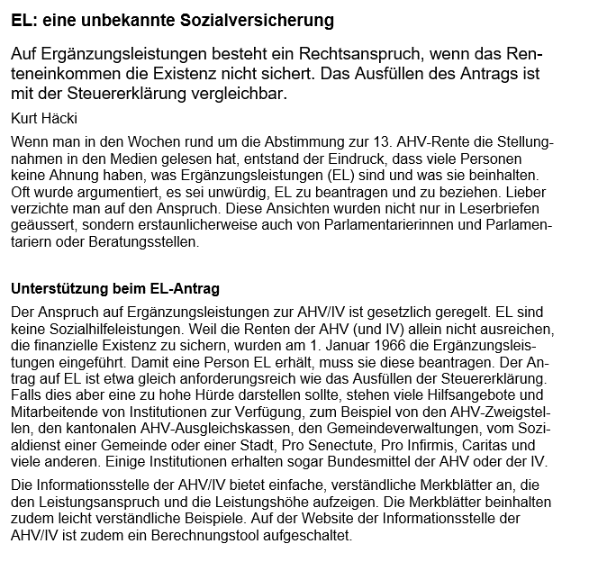 Unser Experte Kurt Häcki hat einen interessanten Artikel über Ergänzungsleistungen geschrieben: